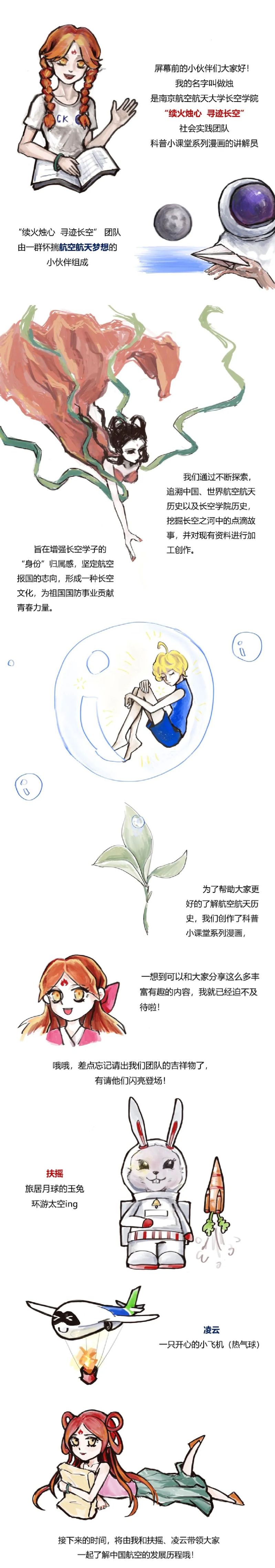 从吉祥物到卡通主讲人,从故事框架到语言风格,漫画创作小分队事无巨细、通力合作,精心制作了讲述航空航天史的科普小课堂系列漫画。漫画从美苏航空航天争霸的世界史到中国独立自主发射“东方红一号”中国史,再到南航航空航天专业的发展史,让我们从不同维度了解航空航天的发展历程,在充分展现我国航空航天繁荣发展的同时,客观认清我国的发展现状,激励新一代长空人不忘初心,牢记使命,为我国航空航天事业砥砺前行!